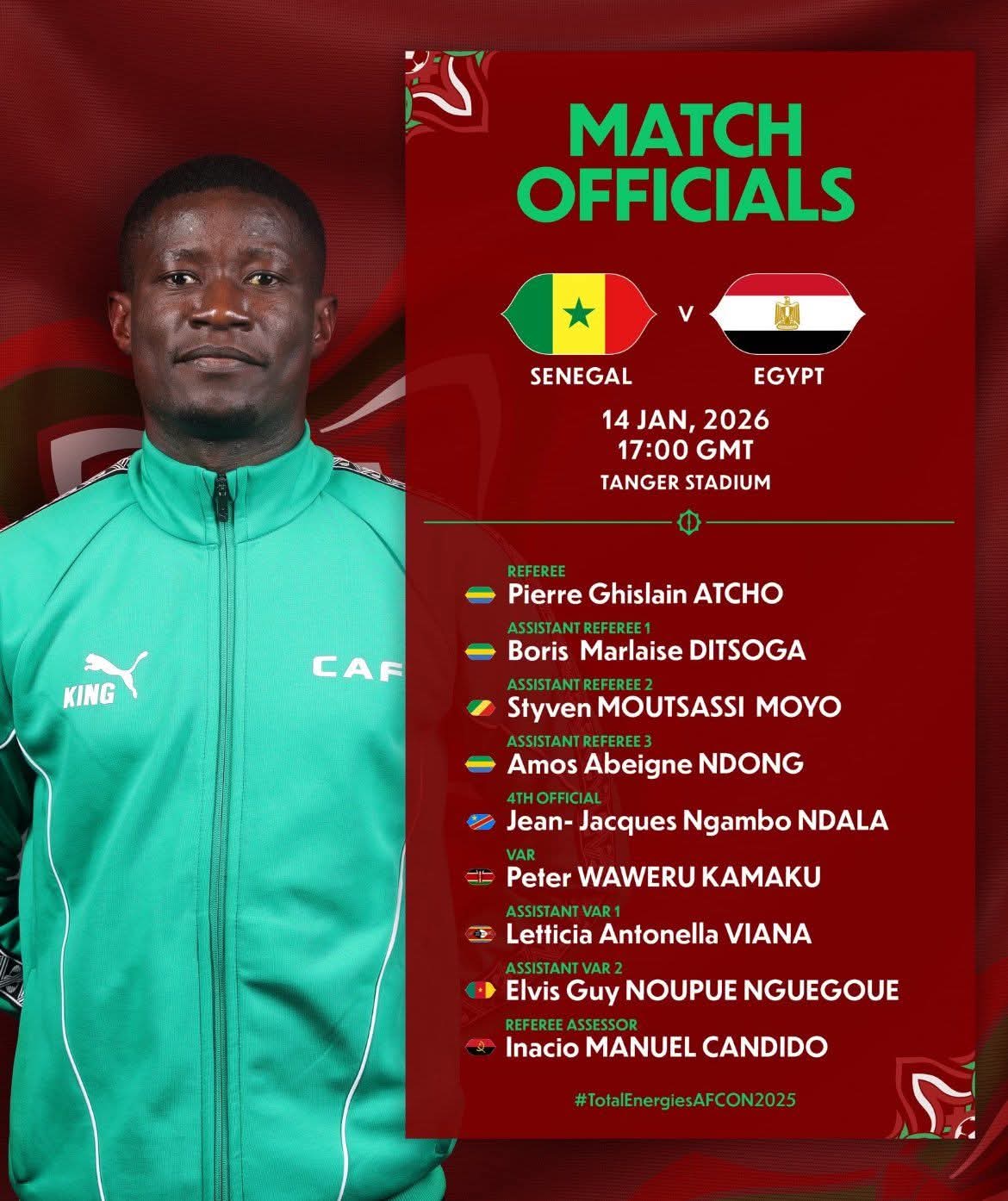 Habitué des grandes joutes continentales depuis 2021, Pierre Ghislain Atcho confirme une nouvelle fois sa montée en puissance sur l’échiquier arbitral africain. Le directeur de jeu gabonais, reconnu pour sa rigueur, sa lecture du jeu et son autorité naturelle, est attendu au plus haut niveau pour cette rencontre capitale opposant deux géants du football africain.