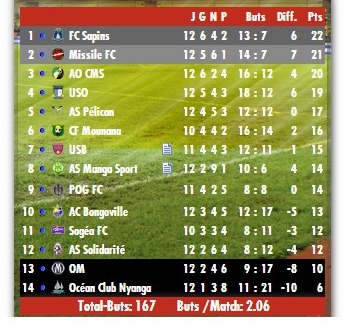 POG FC (9e) n’aura quant à lui pas réussi à freiner les ardeurs de l’AO CMS (3e) bien plus attiré par la victoire : 0 but à 1. Le FC Sapins (1er) qui était très attendu, a dû se contenter d’un seul but à 0 pour venir à bout de l’AS Solidarité (12e). L’OM (13e) et AS Mangasport (8e) se sont séparés sans pouvoir trouver les chemins de filets adverses. Même son de cloche pour le duel au sommet de cette 12e journée où le CF Mounana (6e) devait en découdre avec l’US Bitam (7e). Les deux équipes rivales ont dû se quitter sur un score vierge comme l’ensemble d’ailleurs de leurs prétentions lors de cette phase aller.